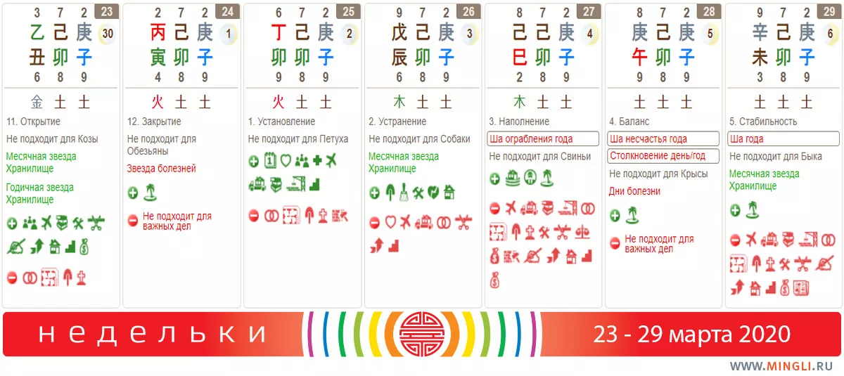 23 марта, понедельник. Хороший день практически для всего, кроме начала строительства, ремонта или свадьбы. Ценные приобретения особенно актуальны. Слабые деревья могут неплохо заработать. Если вы не Бык по году или дня и вас нет столкновения Козы и Быка в карте, вы можете поставить на севере на лист красной бумаги, фонтан или вентилятор на двухчасовку Козы. Посидите спокойно и подумайте о том, как все ваши проблемы разрешаются, исчезают.