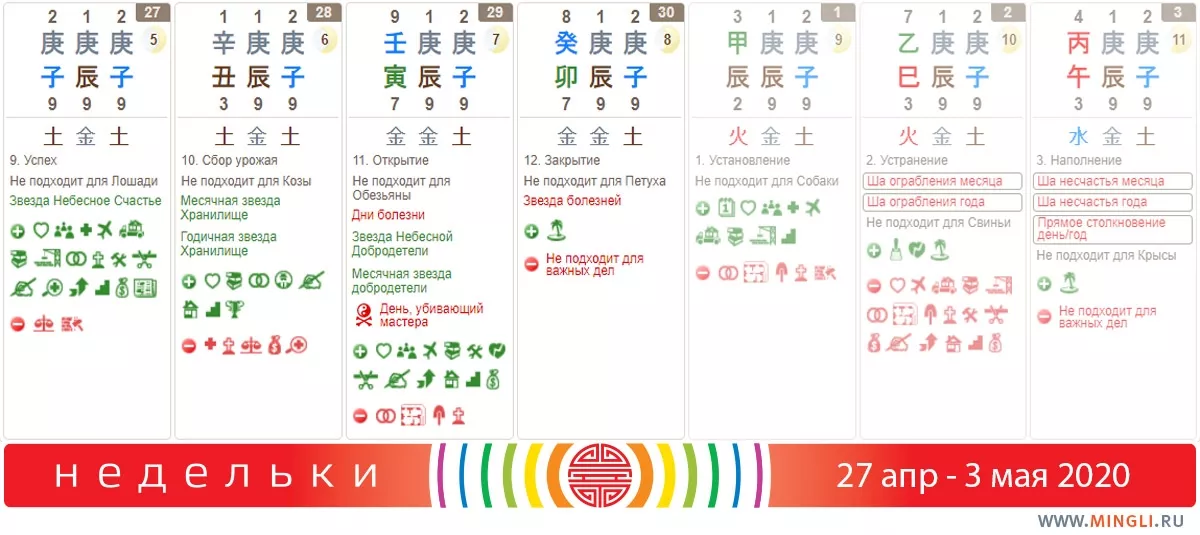 27 апреля, понедельник. Дубликат к году, половинка треугольника воды - тем, кому не полезны металл или вода, или в карте бацзы есть столп Янский Металл на Крысе - не стоит планировать на этот день важных дел. Если же вода или металл полезны, и вы не Лошадь по году рождения - можно рискнуть и провернуть что-нибудь с долгосрочными целями. День подходит для множества позитивных дел. Ремонт только начинать не стоит.