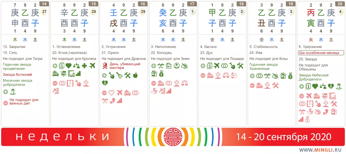 14 сентября, понедельник. Сегодня и завтра не подходят для прорывов и подвигов тем, кому неблагоприятен металл - он слишком силен. Если же ци металла полезна, то день можно использовать для путешествий, ремонта, земляных работ, строительства, свадьбы, переезда в новый дом, начала бизнеса и других проектов, строительства подсобных помещений. Это может принести семье благосостояние и рост собственности.