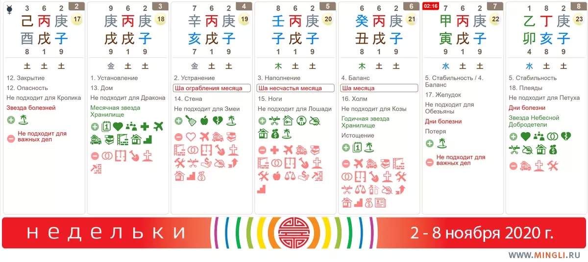 8 ноября, воскресенье. Отличный день (для всех, кроме Петухов). Подходит для земляных работ, строительства, свиданий, свадьбы, переезда в новый дом, путешествий, начала нового бизнеса и проектов. Звезда Небесной Добродетели поможет договориться и разрешить конфликты. Не посещайте больницы и заболевших.