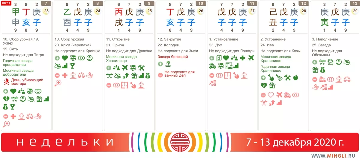 7 декабря, понедельник. Хороший день, несмотря на начало месяца, в нем много благородных звезд, поэтому он благоприятен для большинства важных дел, и приносит богатство, рождение прекрасного сына, удаление препятствий в делах. Можно договариваться, обсуждать, начинать новые проекты. Чего не стоит делать - делать измерения и затевать перестановки. Фэншуисты сегодня отдыхают.
