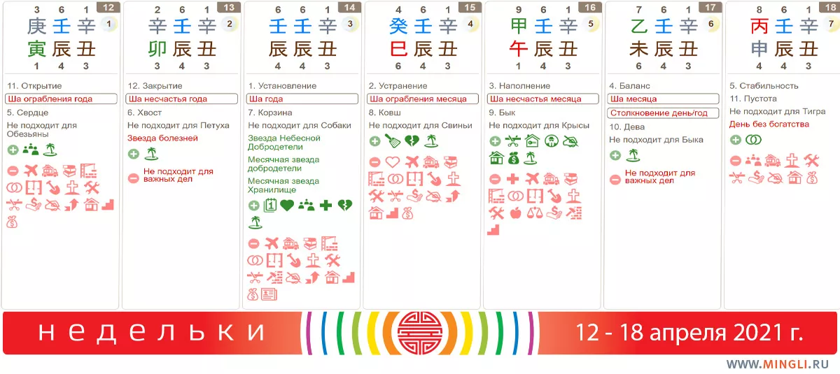 12 апреля, понедельник. День неплохой, но так и тянет потратить побольше, особенно, если вы - слабый Металл. Поэтому лучше отложить решение финансовых вопросов, подписание контрактов и вообще заняться повседневными делами (в целом неделя такая: копим силы, готовимся к прорыву, не начинаем ремонт ил земляные работы). Можно запланировать и провести переговоры. Сильные Металлы Ян и Земли, которым Металл полезен, вполне способны “перетянуть одеяло на себя” и захватить часть рынка.