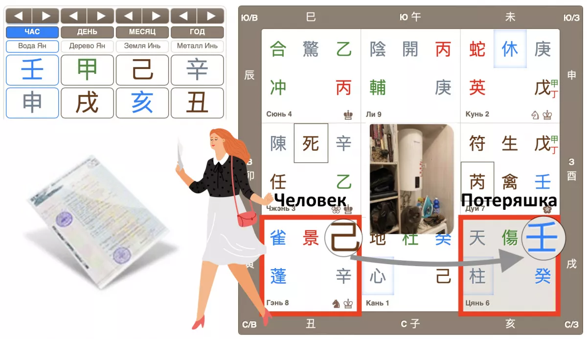 Ци Мэнь, объединяющий время, пространство и человека, позволяет рассчитать самые разные аспекты и обстоятельства. Например, при поиске пропавших вещей, можно вычислить детали, указывающие на местонахождение вещи, вероятность ее нахождения и ориентировочное время для поисков. Ко мне обратилась девушка, которая потеряла ПТС своей машины. Машина была выставлена на продажу, покупатели выехали из своего города, все обыскали, а ПТС не смогли найти. Ну что ж! Открываем расклад Ци Мэнь часа вопроса, выполняем анализ и пишем ответ: