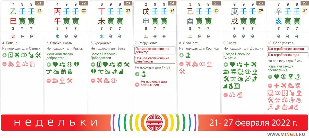 24 февраля, четверг. День-пауза, особенно для тех, у кого в бацзы есть Тигр, Обезьяна или оба вместе, а также Змея. Старые мастера обещают скандалы и измены в течение 3-5 лет тем, кто рискнет запланировать что-то серьезное. В любом случае день довольно травмоопасен, берегите себя. Ремонт, земляные работы или строительство начинать не стоит.