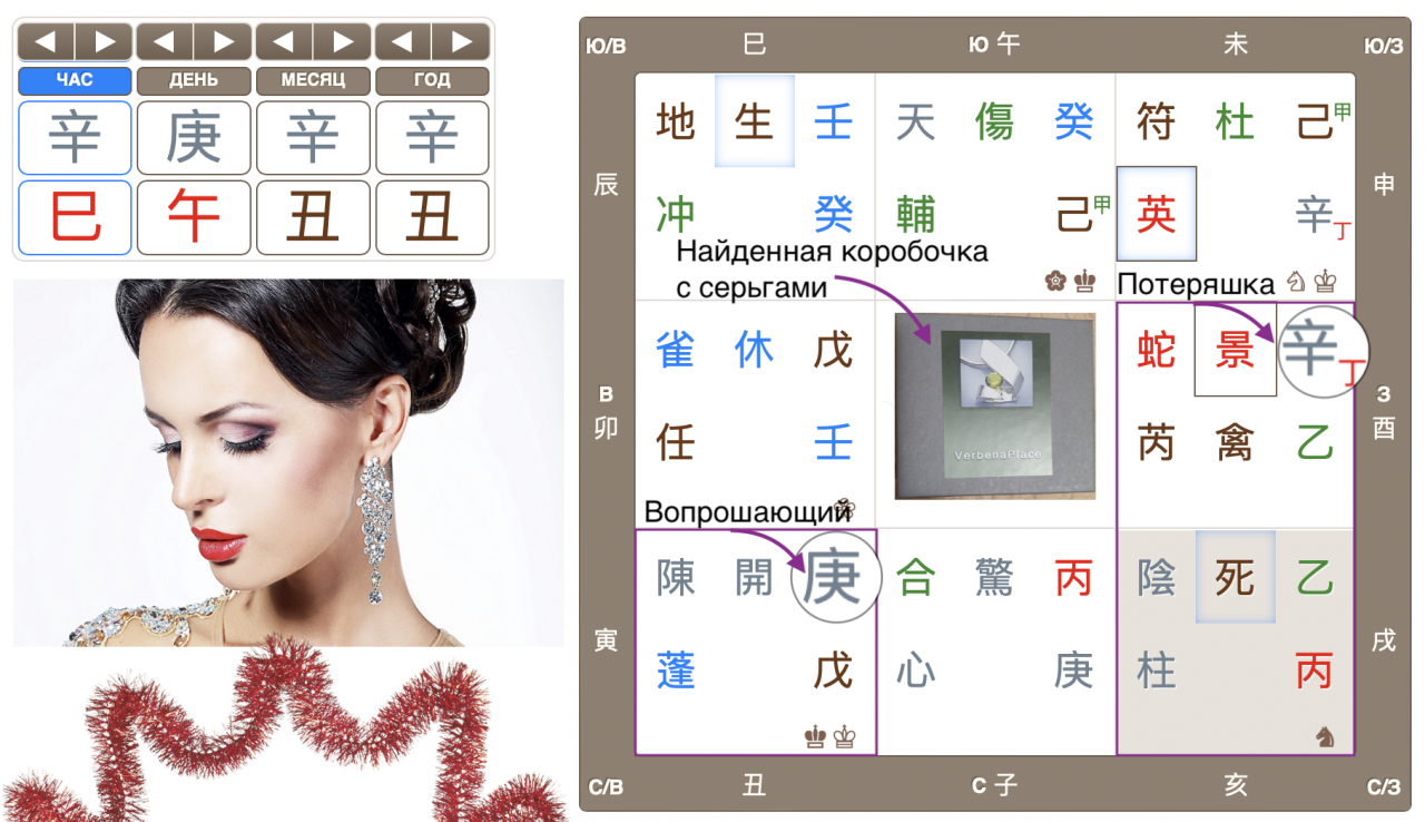 Как точен Ци Мэнь! Даже Небесный ствол часа Дело выпал на ствол 辛 Синь – ювелирное украшение. Украшение очень дорогое и по стоимости (ствол Тай Суй тоже 辛 Синь) и эмоционально (подарок мужа). Серьги Синь 辛 в Пустоте (серый квадрат) – значит найти не просто.