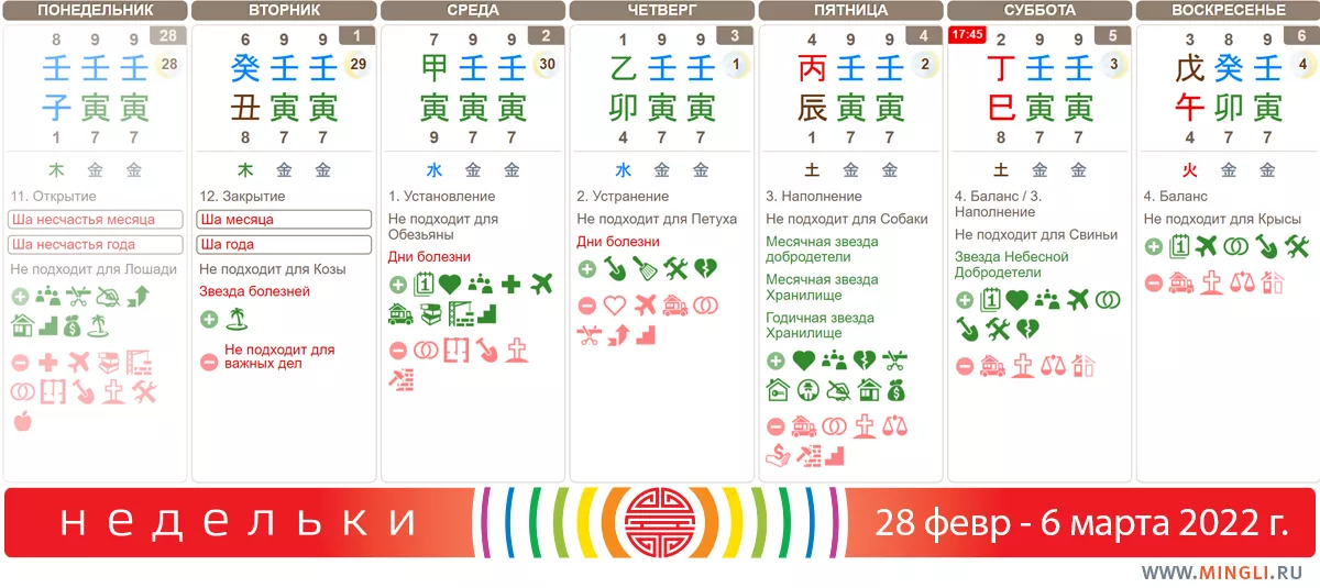 2 марта, среда. Очень сильный день. Использовать можно только в случае, если вам благоприятно Дерево и если вы переносите Тигров в таком количестве (их целых три). В противном случае лучше провести день спокойно, занимаясь повседневными делами. Особенно, если у вас в карте бацзы есть Обезьяна. Не подходит для свадеб и праздников, массовые мероприятия, как и вчера, посещать не стоит, в первую очередь, пожилым людям. Если Земля - ваш полезный Бог, есть проблемы с печенью, желчным, пищеварением - берегите себя (на завтра советы схожи).