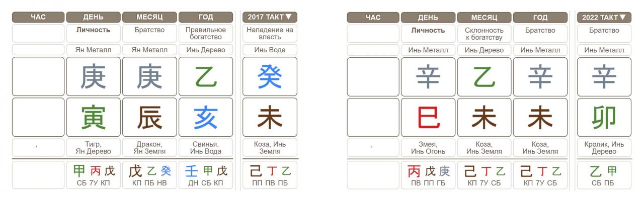 Какая карта бацзы у Никиты? Земная ветвь месяца поддерживает его господина дня, час неизвестен, столп года поддерживает. Судя по успеху на Олимпиаде этого года, ему нужны для карты вода и дерево. В карте Вики есть вода и дерево. У нее тоже интересная карта, есть целый столп поддержки в месяце и ослабляющие карту дерево и вода в столпе года. Между их картами усиливается дерево, свинья с козой и у обоих в карте дерево прорастает в небесный ствол. Дерево для них результат, навыки, деньги. Вполне возможно, что Вике и Никите полезна стихия дерева. Тогда в 2023 год кролика им будет способствовать удача.