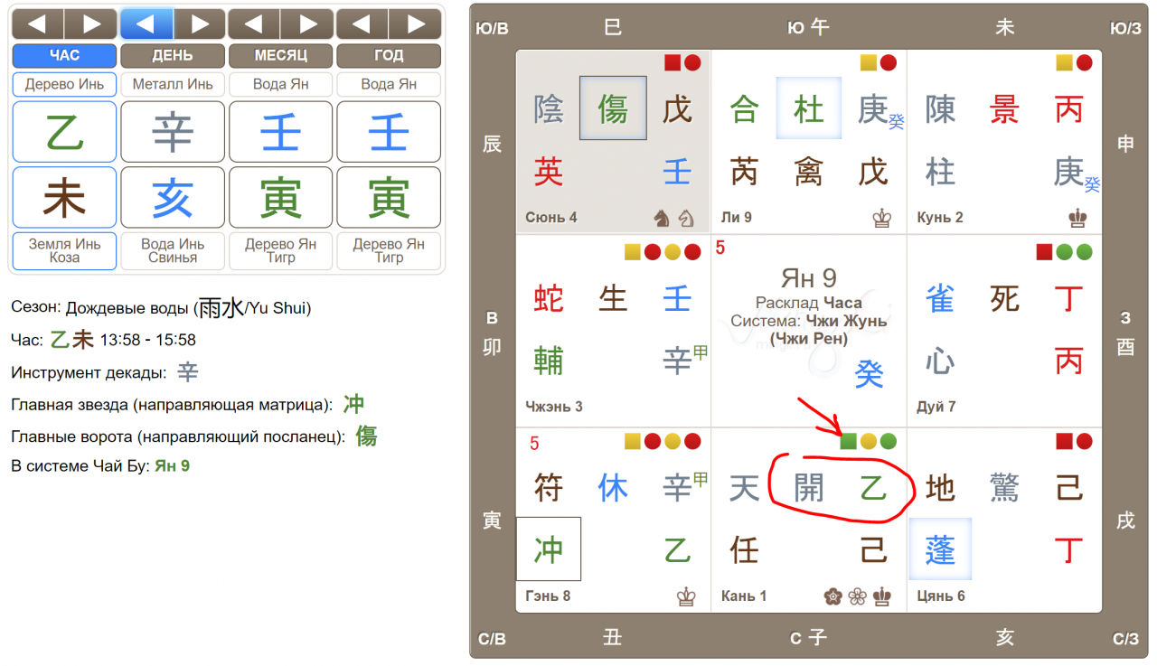 2. Если вы немножко знаете Ци Мэнь, ищите в ближайшие часы в нужном вам направлении счастливые врата с Мистиком (верхний иероглиф из двух, на небесной тарелке). Отлично, если вся структура хорошая или средняя: