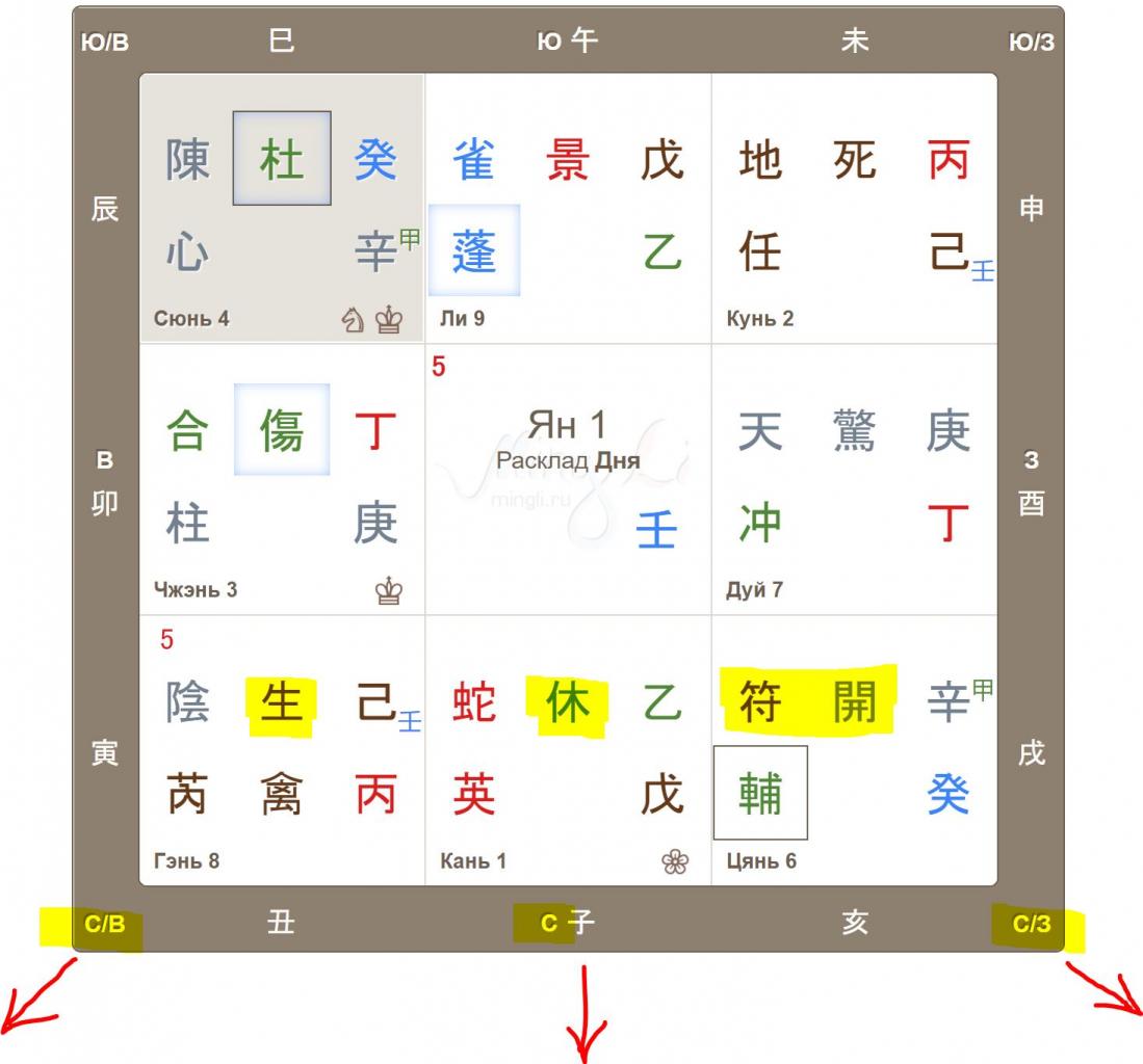 Один из элементов карты Ци Мэнь – это врата. Вот, они у нас на рисунке отмечены желтым: