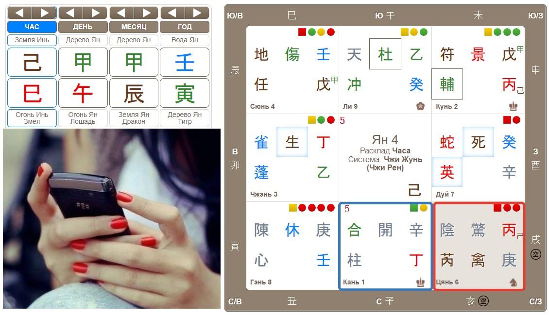 Однажды утром сын обнаружил пропажу телефона. Поискав его в комнате, а затем, сообразив, что я каким-то волшебным образом могу ему помочь, обратился ко мне с вопросом: «Мама, где мой телефон?». Я тут же открываю расклад Ци Мэнь Дунь Цзя и вижу, что дома искать бесполезно, оставил его где-то. Сын 辛 выпал во дворец Кань, а предмет поиска 己 – в Цянь. Вчера сын вечером был у друга 壬, потом возвращался домой пешком, и так как шел час Змеи на момент задания вопроса, я сразу направила его на поиски к другу.