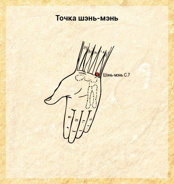 - Воздействие на точку Шэнь-мэнь на внутренней стороне запястья. Она относится к меридиану Сердца и отвечает за психику.