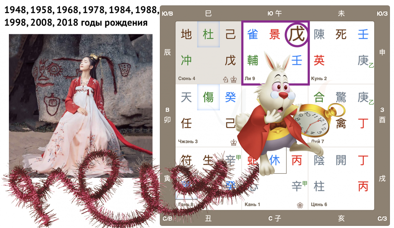 Рассмотрим «поле» для деятельности – дом Чжэнь, движение Дерева, рост снизу вверх. Знаки года попали в атмосферу, где есть стремление «вырасти», подняться вверх, измениться, поменять. Но, в «дом» года, Чжэнь, прилетели силы, противодействующие быстрым переменам. Первая из них – это ствол иньской Земли 己 Цзи, вместе с ним формируется комбинация двух иньских стволов 癸己, которые, объединившись, не способны к росту. Вторая удерживающая сила – врата расклада, которые остались на своей домашней позиции, то есть люди хотят остаться при своих убеждениях и действовать так, как ранее. Однако, дух 天 9-ти Небес призывает к активности, расширению кругозора, врата 傷 Ранение тоже о движении. Мы видим силы, которые хотят и ждут перемен, но есть и факторы, их сдерживающие. При такой комбинации знаков быстрых перемен ждать не стоит, скорее это будут попытки или шанс на изменения. Надеемся, что счастливый, ведь в доме сияет звезда дальновидности и стабильности 任 Небесный Чиновник.
