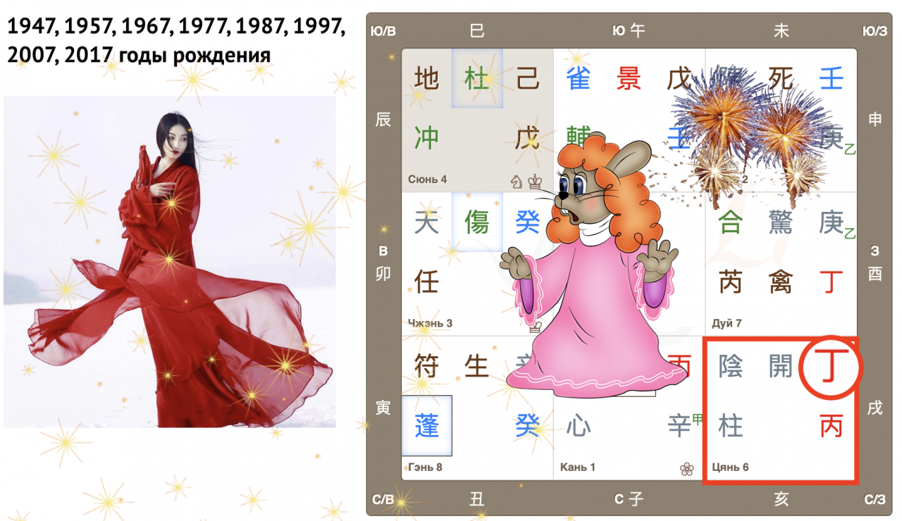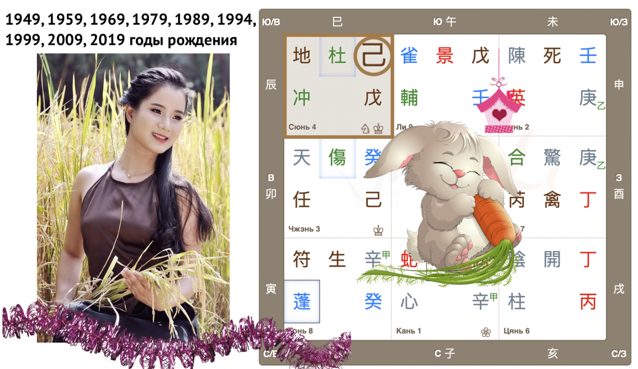 - сочетание стволов, где ствол года 癸 Гуй «сидит» на плодородной земле 己 Цзи, может говорить о приоритетах развития сельского хозяйства;
