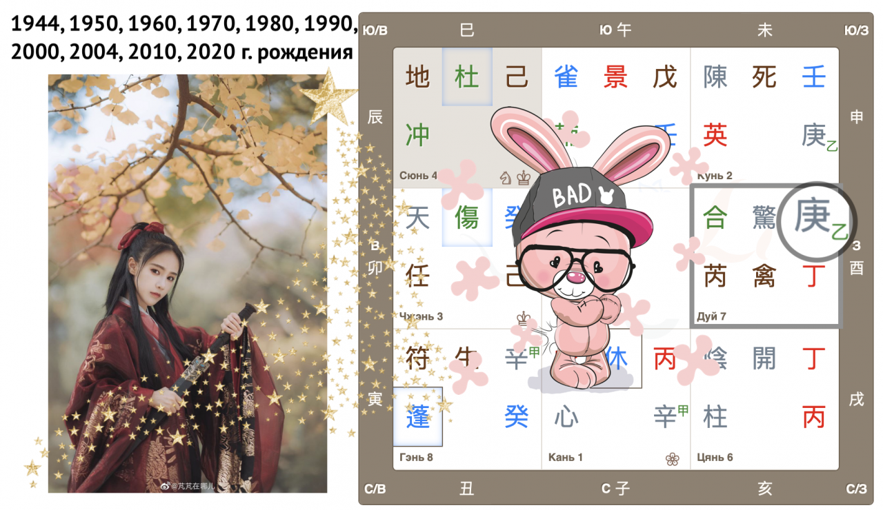Как видим, Небесный ствол года 癸 Гуй (иньская вода) опустился в дом Чжэнь с Земной ветвью 卯 Мао (Кролик). Вот так сюрприз! Ствол и ветвь приходящего года в одном дворце, так случается далеко не всегда. Можем предположить, что влияние энергий года четко выражено, удвоено.