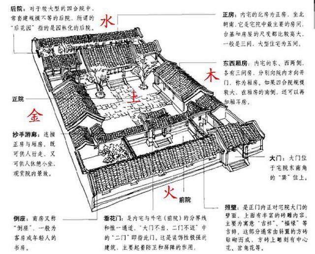Главный вход ведет в небольшой прямоугольный дворик. За вторыми воротами находится экран 影壁 инби (дословно: стена отражений, или стена теней), который защищает жилище от посторонних взглядов и злых духов.