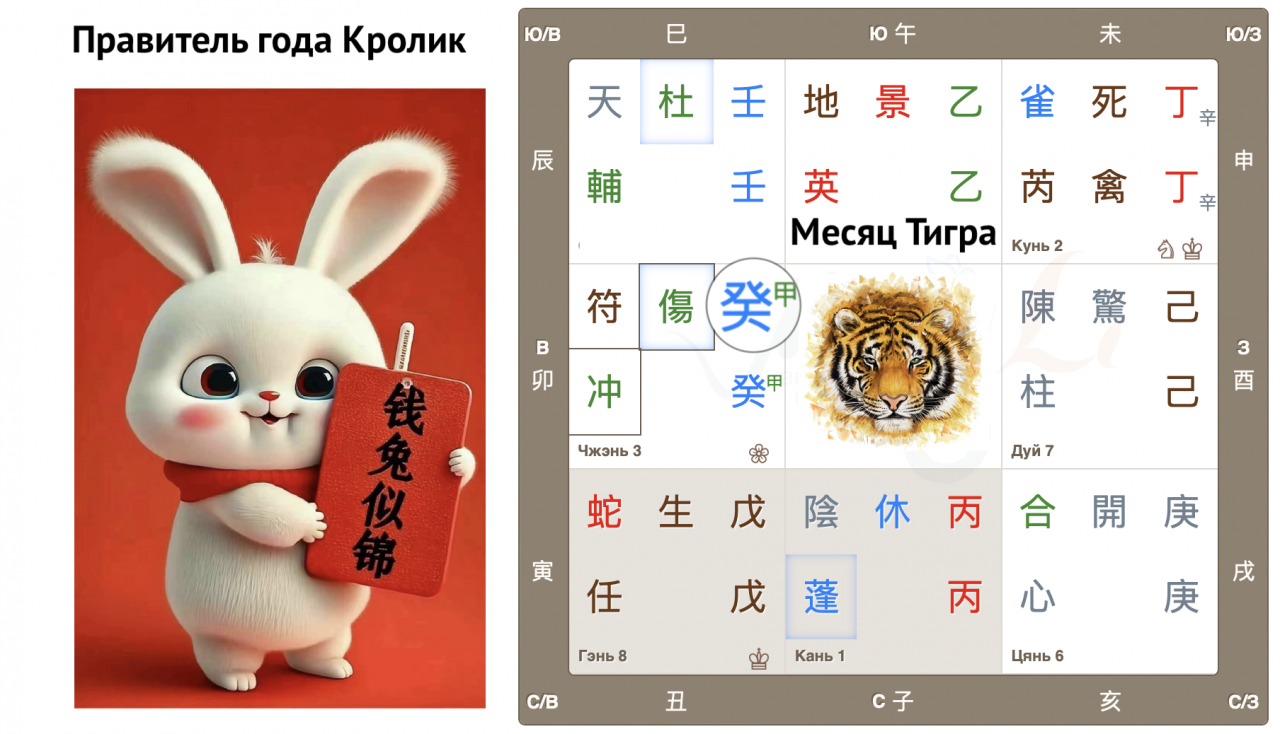 Небесный ствол (НС) месяца в феврале 2023 – 甲, но он спрятался за 癸, который опустился во дворец Чжэнь с Земной ветвью 卯 Мао (Кролик). Интересное начало года: НС месяца дублирует НС года! Можем предположить, что месяц будет очень важным, т.к. энергия удвоена.