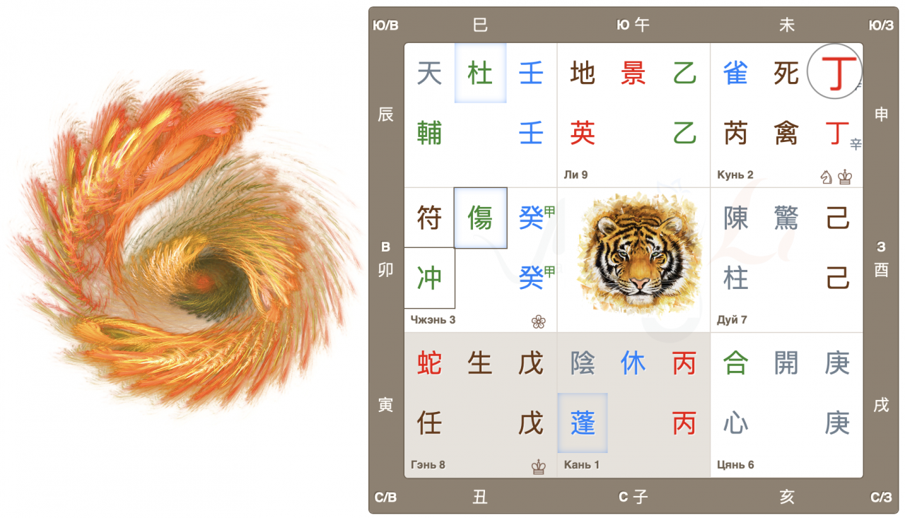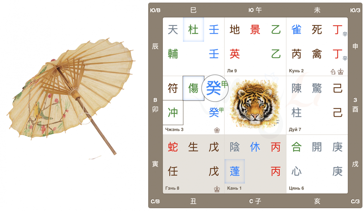 Во дворце Чжэнь собрались 3 важных знака: Главный дух 符 Джи Фу, Главные врата 傷 Ранение и, Небесный ствол года 癸, Тай Суй. Высока вероятность принятия судьбоносных решений, в том числе во властных структурах.