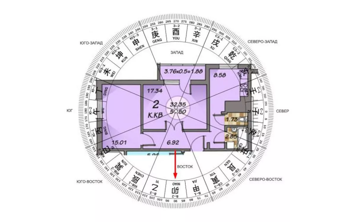 Точно также наложите шаблон на план квартиры, как бы уменьшая его до размеров помещения. Если ваш дом смотрит на восток, то и стена квартиры, параллельная фасаду дома, также будет смотреть на восток.