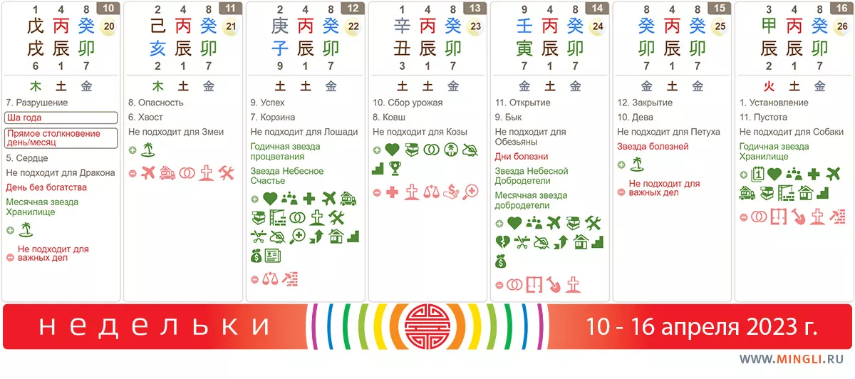 Месяц Дракона уже вступил в свои права и до 5 мая идет период Огня и Земли. Если эти элементы вам благоприятны, то стоит его использовать активнее. Помните также, что с 21 апреля пойдет ретроградный Меркурий, и если вы планировали запустить что-то новое – лучше сделать это до 20 апреля. Например, среда и пятница на этой неделе вполне подойдут для больших начинаний.