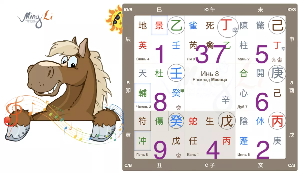 Главные Врата Ранение 傷 и Главная звезда расклада месяца Небесное столкновение 冲 продолжают напев активности и напора, противостояние ветви и ствола месяца также добавляет «перчику». Лучше заранее включить в свое расписание медитативные практики или иные способы расслабления, по своему вкусу. Не игнорируйте отдых, все деньги мира не заменят хорошего сна. Укротить норовистую лошадку июня 戊午 можно только с передышками 😊.