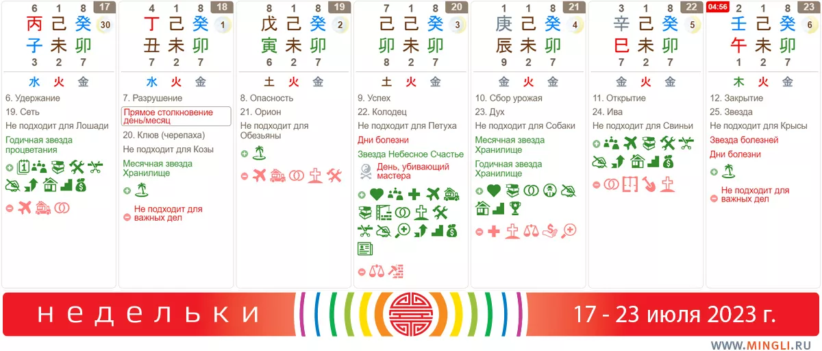 18 июля, вторник. Неблагоприятный день, особенно для тех, у кого в карте есть Коза и/или Бык. Такое столкновение провоцирует на ссоры, недопонимание, небольшие травмы и происшествия на дорогах. Ремонт дома начинать однозначно не стоит – в центральном дворце находится сильная ша. Иньские Огни по дню рождения, а также Земли – берегите здоровье.