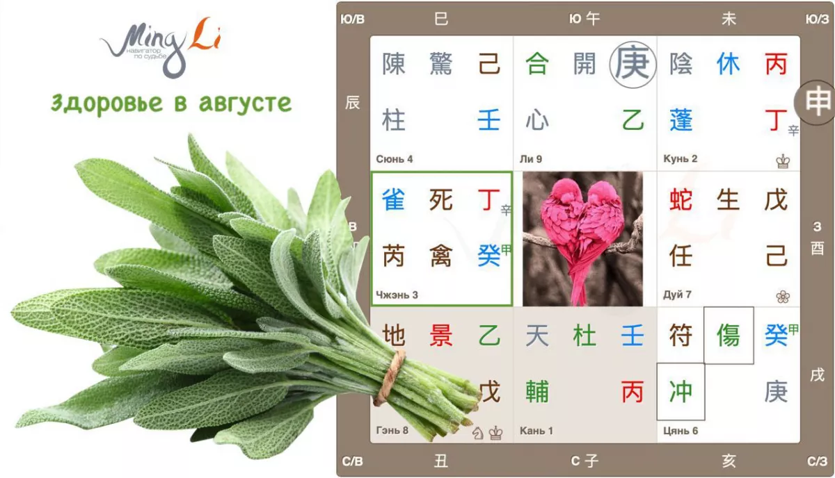 На закуску рассмотрим дворец Цянь. Здесь тоже есть важные знаки расклада. Снова видим указание на внезапность! Звезда Небесный Гром 冲 – такая же бойкая, как ее родной дворец Чжэнь. С рассмотрения Чжэнь мы и начинали наше аналитическое путешествие. Структура 癸庚, врата ранения 傷 в союзе со звездой 冲 предупреждают о возможных травмах и нарушениях целостности. Планируйте активный спорт только с проверенными инструкторами. Если вы новичок в спорте и решили «поднажать и раскрыться», то август месяц – не лучшее для этого время. Травмы спины, головы и опорных костей в организме имеют высокую степень вероятности.