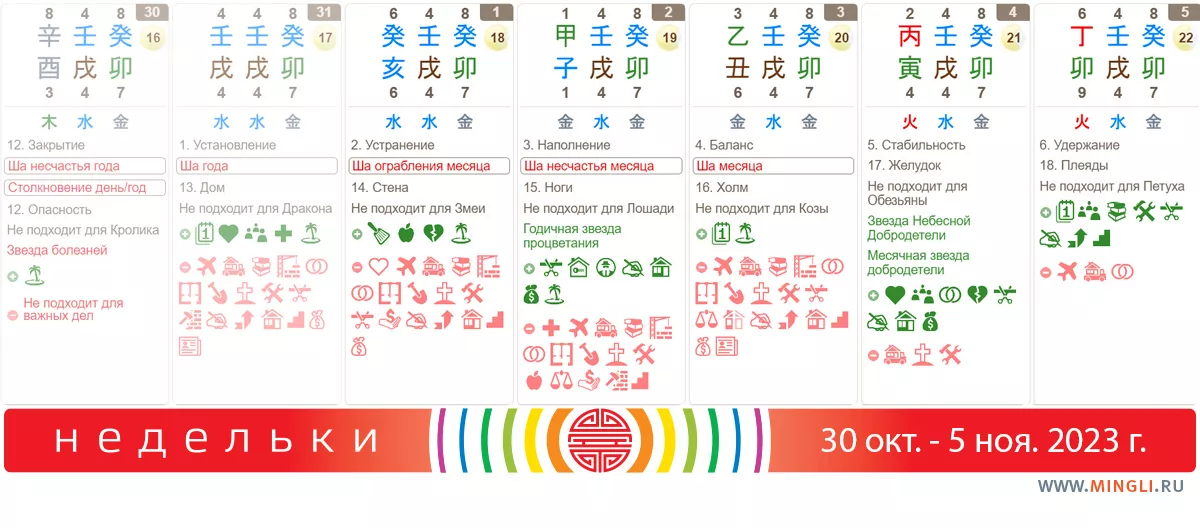 31 октября, вторник. Подойдет для планирования, обсуждений, переговоров (без итогового подписания договоренностей), поиска медицинской помощи, свиданий. Напрягаться и пытаться вписаться в сроки не стоит. Важные дела, сделанные сегодня, приводят к бедности. Тем, у кого в карте Бацзы стоит янская Вода на Собаке или Драконе, важные дела лучше не планировать. Вообще выглядит как день землетрясения или цунами, но, надеюсь, обойдется, все же не все признаки присутствуют.