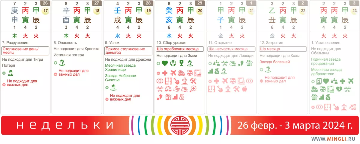 26 февраля, понедельник. Для важных дел не подойдет. Товарищи китайцы при нарушении этого правила намекают на судебные иски и споры, скандалы и любовные измены в течение 3-5 лет. День сплошного Металла весной. Это как если бы вы болели за сборную Х, а пришли и сели бы в сектор У во время матча, когда Х и У сражаются на поле. Представьте, сидите вы все такие в серых цветах своей команды – а вокруг одни зеленые…Вряд ли вы сможете перекричать их, скандируя имя своего любимого футболиста. Именно поэтому такие дни – противоречащие сезону – и называются «Потерями» и, традиционно, для важных дней они не подходят. Все бы ничего, но сегодня – еще и Столкновение. Именно поэтому ничего важного не планируем, а если в карте есть Обезьяна и Тигр, стараемся осторожнее вести себя на дороге, не вступать в конфликты. Одеться лучше в черное или темно-синее.