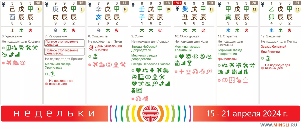 19 апреля, пятница. Не стоит заниматься ремонтом, переезжать в новый дом. Нарушение этого правила приведет к болезням, потере благосостояния, слухам. Несмотря на довольно сильную фазу ци Воды, она ограничена землей, поэтому если Вода вам полезна, использовать этот день можно, но пользы он принесет не много. Свидания, начало учебы, возврат долгов и подписание документов (в свою пользу) вполне возможен, если эти дела не супер важны для вас.