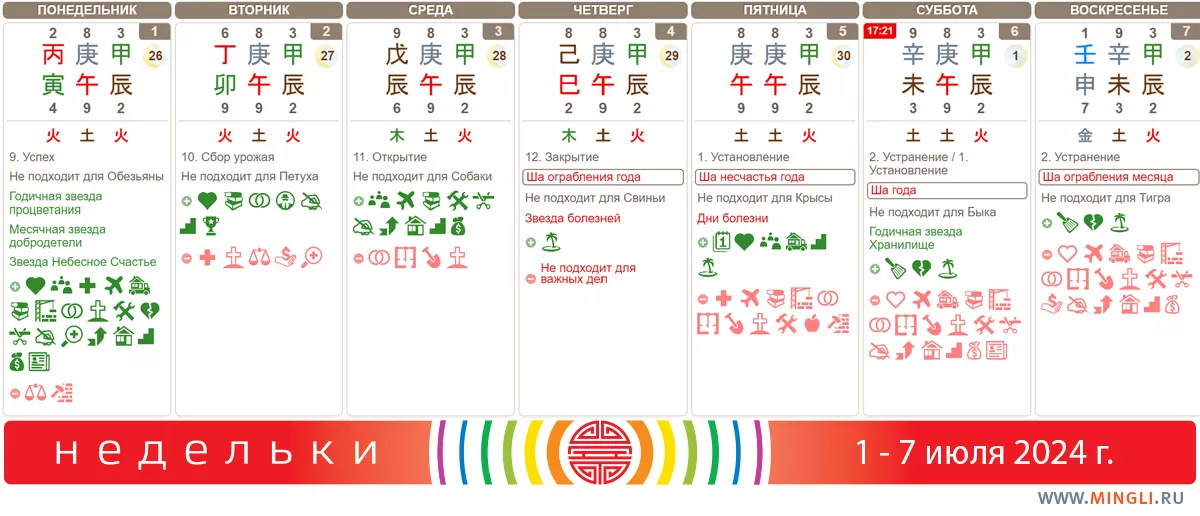 1 июля, понедельник. Очень хороший день для строительства, земляных работ, переезда в новый дом, начинания бизнеса и проектов. Сделанное дело принесет много праздников и богатства в течение 60-120 дней. У семьи будет хорошая репутация и крепкое здоровье. Обезьянам по году не факт, что подойдет, как и тем, кому Огонь не полезен.