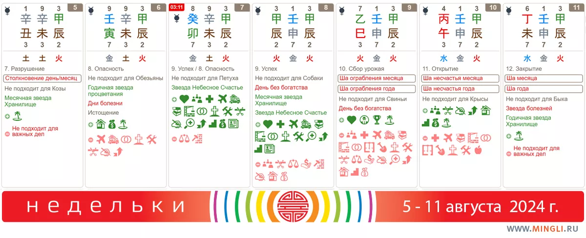 8 августа, четверг. Лучше не использовать день для решения финансовых вопросов – удача семьи уменьшится. Если любое дело связано с деньгами – платежами, подписанием документов и т.п. – браться за него сегодня не стоит. Но день подойдет для большого количества позитивных дел, список достаточно широк. Учтите также дубликат к году. Если в карте Бацзы у вас есть янское Дерево на Драконе – принимать важные решения и вообще торопиться не стоит.