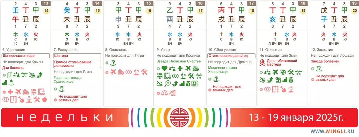 15 января, среда. День не самый плохой, но и не прекрасный: подходит для дел средней важности, если вы не родились в год Тигра или если Дерево не является вашим полезным богом. Янским Деревьям и Огням стоит внимательнее отнестись к собственному здоровью: берегите себя, не перетрудитесь!