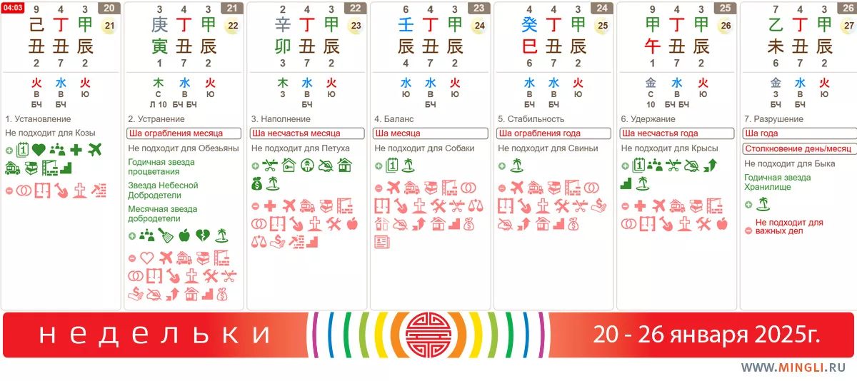 21 января, вторник. Интересное сочетание. В целом, день неплохой, в нем много благородных звезд, но ша ограбления вносит свои ограничения. Поэтому в разряд «не стоит» у нас попадают любые дела, связанные с финансами и важными документами, а также путешествия. В первую очередь на свои финансы стоит обратить внимание иньским Металлам – сегодня, скорее, можно потерять, чем приобрести. Чем можно заняться? Назначить переговоры (не о деньгах, если не знаете, как использовать ша), убраться, расстаться с токсичными людьми, устранить препятствия.