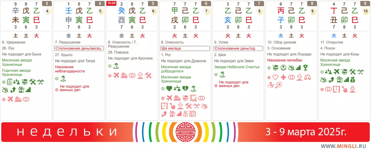 7 марта, пятница. Столкновение портит хороший денек, жаль. В первую очередь стоит обратить на день внимание тем, у кого в карте Бацзы есть столпы 乙亥 или 乙巳 или просто Свинья со Змеей. Сюрпризы также могу ждать тех, кому Дерево неполезно, особенно в час Козы. Постарайтесь на это время не планировать что-то важное. В целом день конфликтен, так что просто займитесь привычными делами, которые не требуют сверхусилий, а также отложите споры.