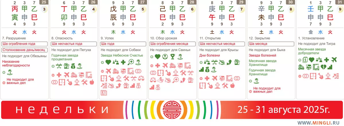 25 августа, понедельник. Действительно не задался). Три в одном: столкновение, ша ограбления, наказание неблагодарности. Поэтому на этот день действительно лучше не планировать важные задачи или потенциально конфликтное общение, особенно если в вашей карте бацзы есть части Огненного наказания: Тигр, Обезьяна и Змея. В первую очередь, противопоказано отправляться в дальний путь, решать финансовые вопросы или подписывать документы. Часы Тигра, Змеи и Обезьяны стоит провести максимально спокойно и консервативно.