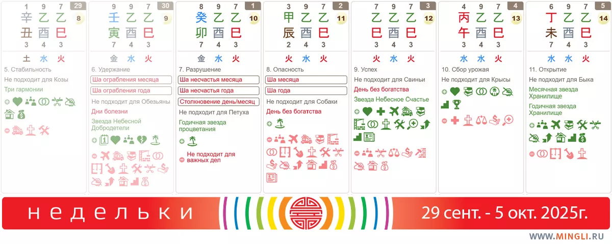 29 сентября, понедельник. Отличный день с хорошим потенциалом. Если вам полезен Металл - втройне! Подойдет для любых позитивных дел, важных мероприятий, особенно таких, которые объединяют людей, для всех, кроме Коз и нелюбителей металлической ци. Можно начинать масштабный бизнес, расширять свое влияние, открывать филиалы.