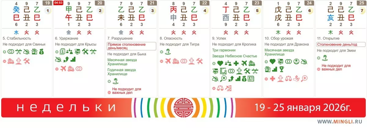 25 января, воскресенье. И снова Столкновение. На этот раз - Свиньи и Змеи. А, значит, всем обладателям этих знаков, особенно, в году или в дней, стоит быть осмотрительнее за рулем, во время перехода улицы, в быту. Избегайте сложных разговоров и конфликтов и день пройдет хорошо!