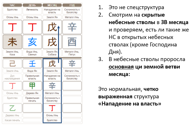 - Если же и их вы не нашли, то структура карты, характер и предпочтения человека не будут ярко проявлены. В этом случае мы будем считать богом, образующим структуру, основную ци, то есть первый скрытый небесный ствол в месяце.