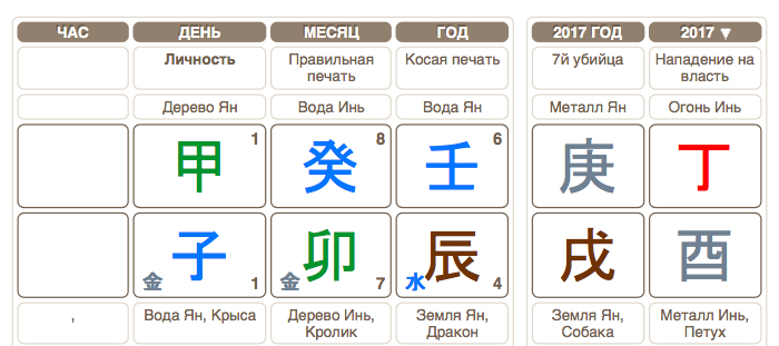 В карте этого янского дерева 甲, рожденного в сезон дерева, отсутствуют огонь и металл. По сути мы смотрим на сильную карту янского дерева, для которого будут полезны янский металл 庚 и элемент огня. Огонь является для него самовыражением и творчеством, а металл отвечает за дисциплину и власть. Недостаток этих элементов говорит нам о том, что ему, скорее всего, сложно четко выразить свои мысли, а также отсутствие дисциплины как таковой. Имея дневной столп 甲 子 , мы видим, что его дерево плывет по течению, привнося, тем самым, нестабильные эмоции в его жизнь.
