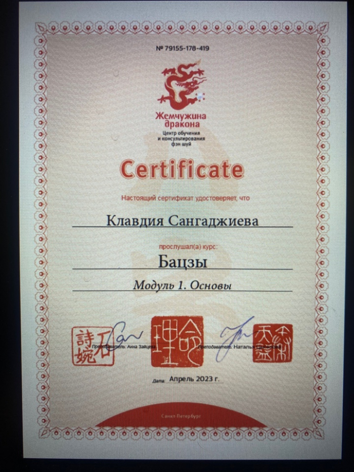 Меня зовут Клавдия, я сертифицированный консультант по Бацзы от центра обучения и консультирования "Жемчужина Дракона". С января 2023 года прошла все обучающие курсы по Бацзы на Минли. С осени 2023 года успешно провожу консультации. От всей души благодарю за полученные знания преподавателей, Анну Зайцеву и Наталью Цыганову. На данный момент продолжаю обучение на курсе по фэн шуй на Минли.
