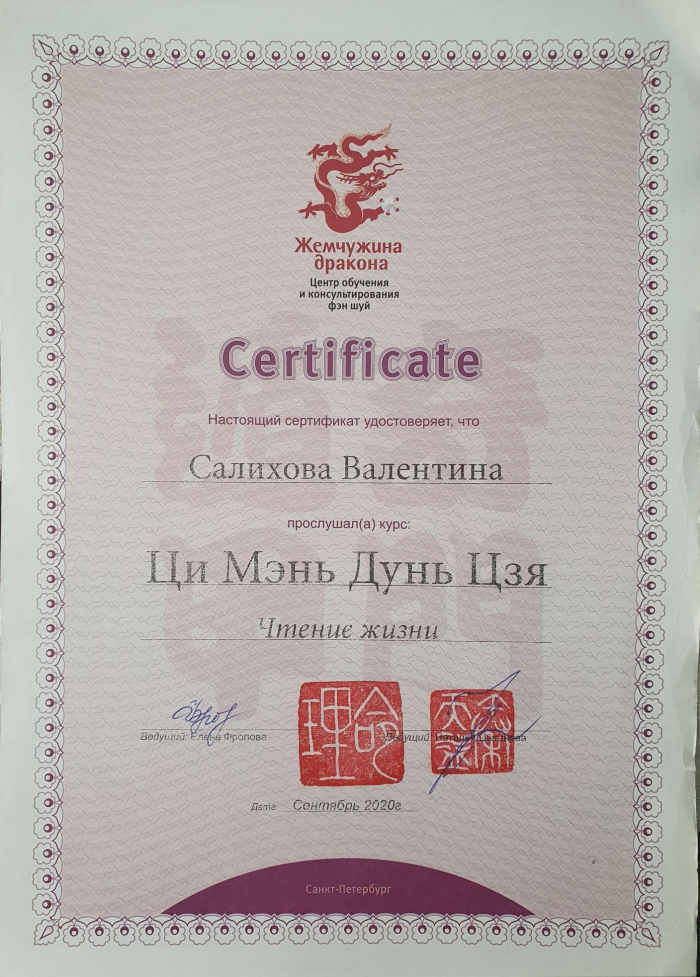 Меня зовут Валентина Салихова, я консультант по китайской метафизике (Ба цзы, Ци Мэнь): • анализ судьбы, • прогнозы, • повышение удачи, • выбор дат для важных событий.