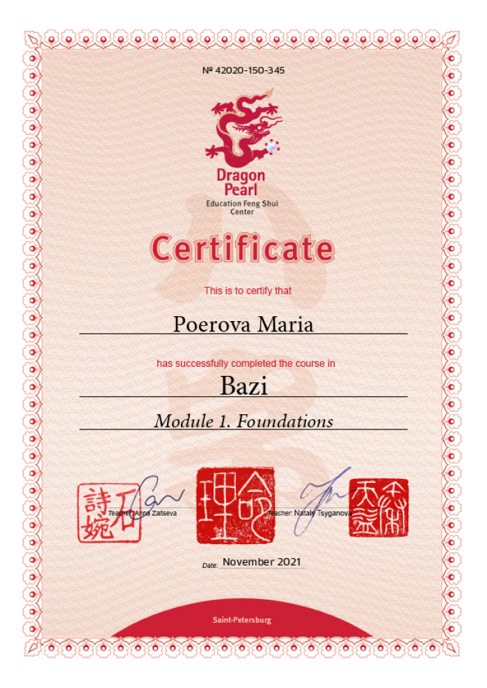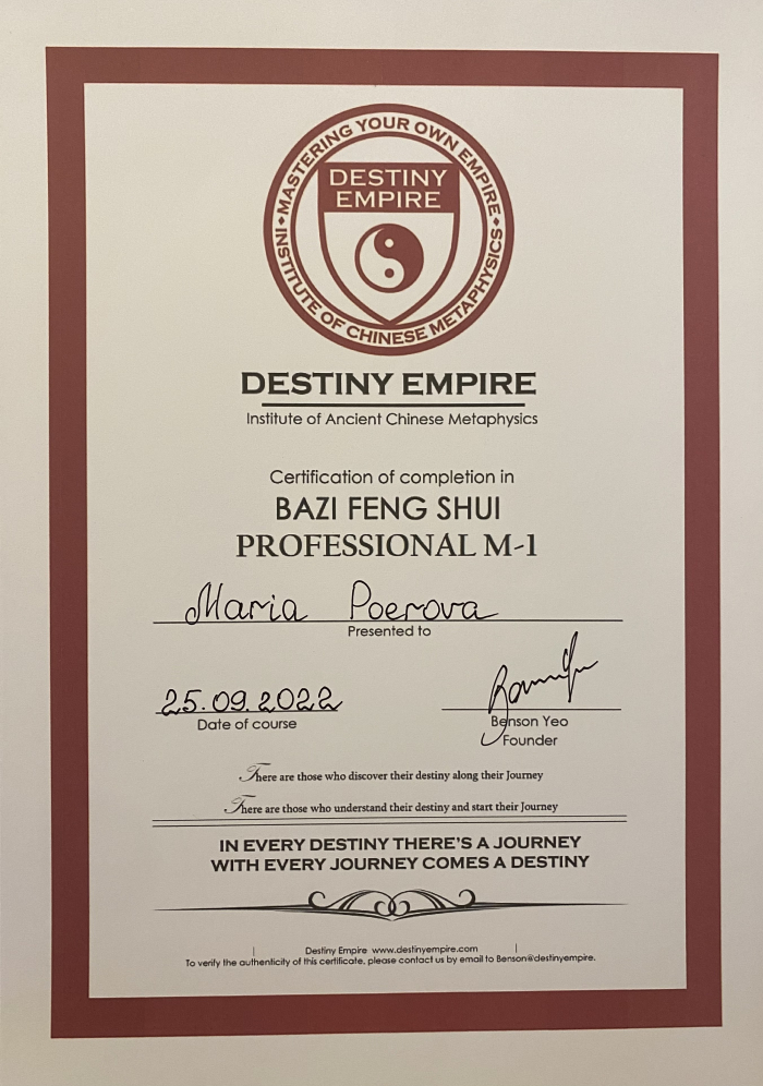 Меня зовут Мария, я сертифицированный консультант центра «Жемчужина Дракона» по фэн-шуй и бацзы.