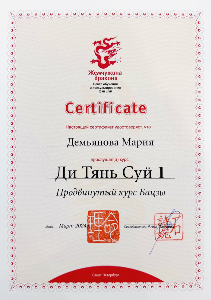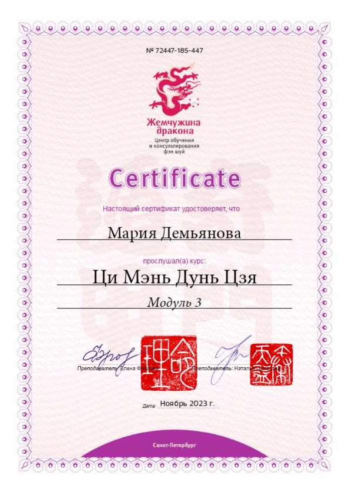 За последние годы я решила систематизировать свои разобщённые знания по фэн шуй и другим наукам китайской метафизики, за что безмерно благодарна школе Mingli, в которой я приобрела прочный фундамент по фэн шуй, бацзы, ци мэнь дунь цзя. Также мне посчастливилось пройти «золотой стандарт Сань Хэ», включающий императорский фэн шуй, внешний и внутренний Сань Хэ, у Мастера Вин Лео, а также пройти курс «Летящие звёзды Сань Юань» по лицензии Мастера Френсиса Леяу.